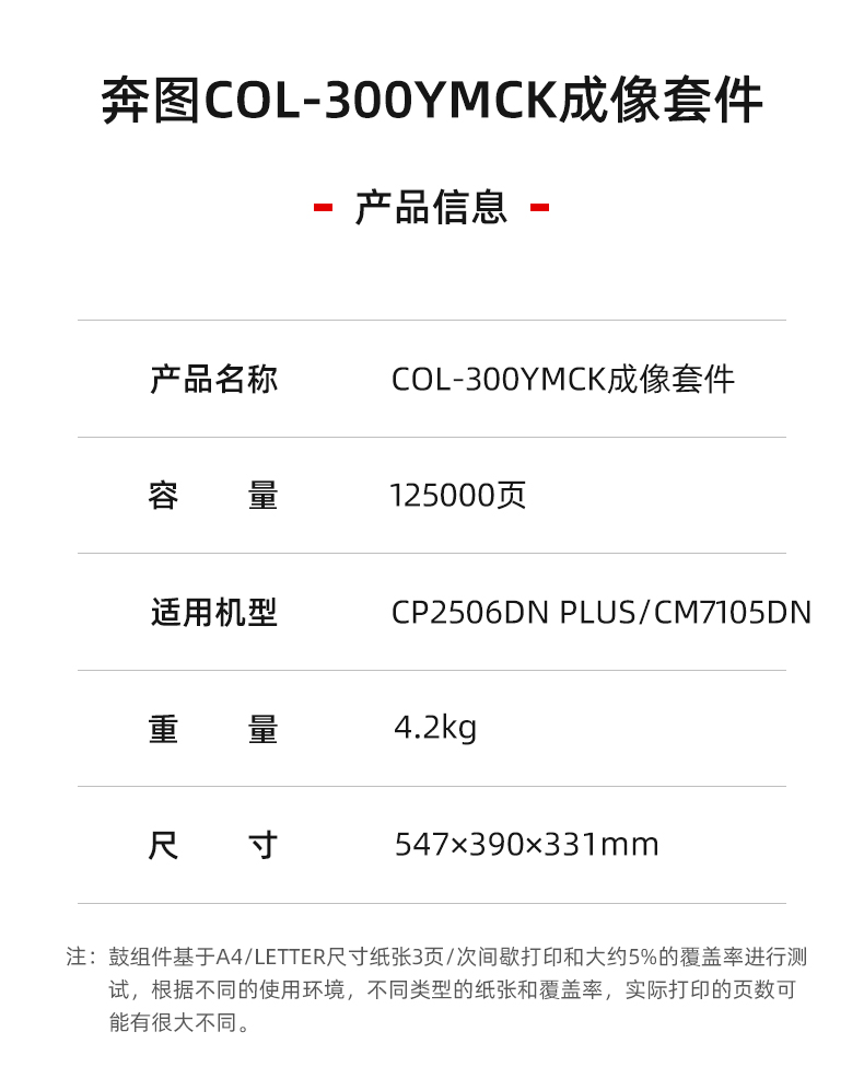 • 商品名稱:奔圖(Pantum)COL-300YMCK 四色成像套件 適用于CP2506 PLUS/CM7105/CM2300