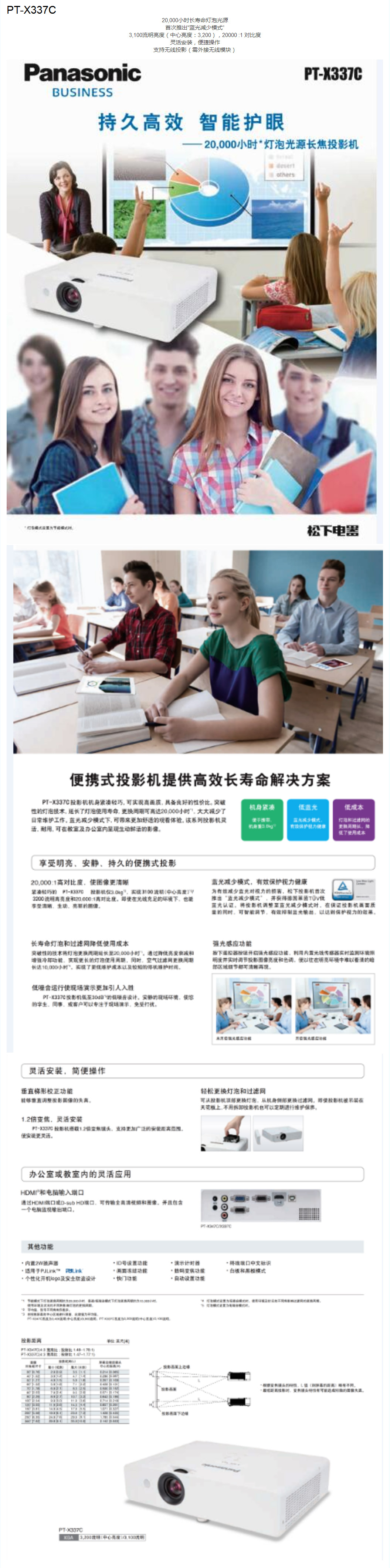 • 商品名稱:松下投影機 PT-X337C (XGA分辨率 3200流明帶HDMI接口,燈泡壽命2萬小時)