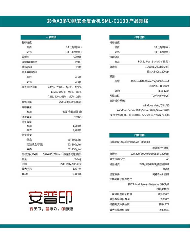 • 商品名稱:安普印(SecuPrint)SML-C1130 A3彩色多功能一體機 國產安全復合機 主機+輸稿器+四紙盒
