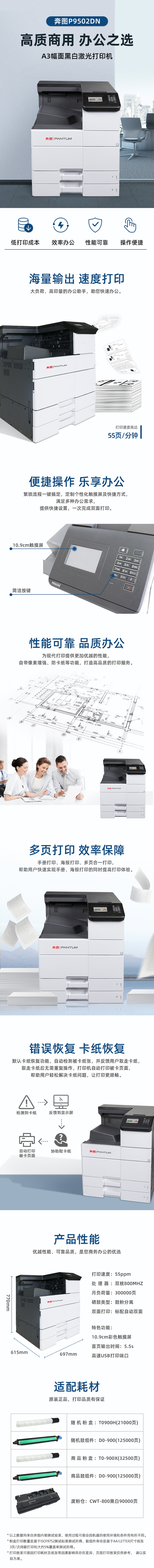 - 商品名稱:奔圖(PANTUM) P9502DN黑白A3激光打印機(55頁每分鐘/雙面打印/A3打印/USB打印/網(wǎng)絡打印/可加大容量紙盒)