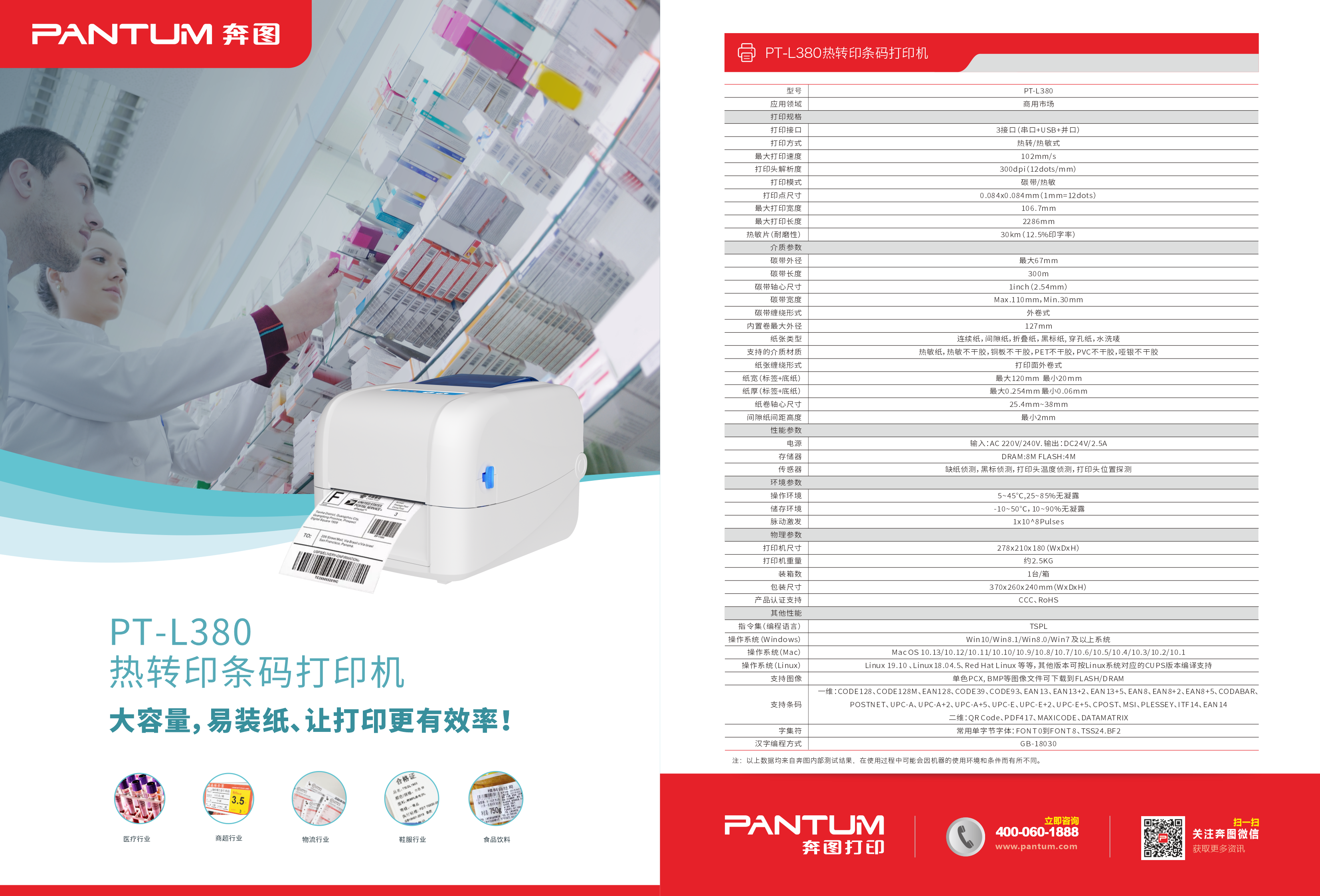 - 商品名稱:奔圖(PANTUM) PT-L380標(biāo)簽機(jī)條碼打印機(jī)(分辨率300DPI/速度127mm每秒)