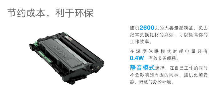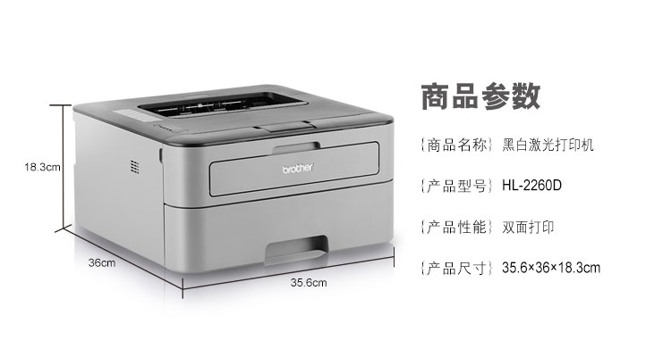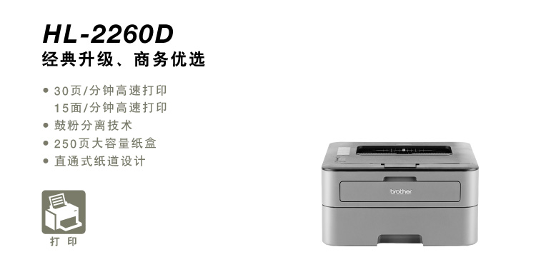 - 商品名稱:兄弟(brother)HL-2260D A4幅面黑白激光打印機 自動雙面打印/不支持網(wǎng)絡打印/30ppm/600dpi/鼓粉分離/適用耗材:DR-2350/TN-2312/TN-2325 一年保修