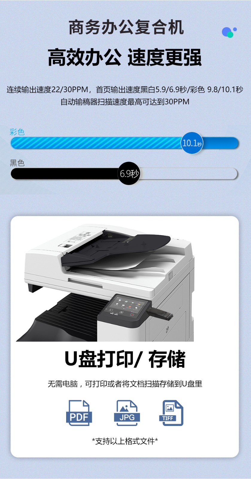 • 彩色首張復(fù)印時(shí)間:8.7s