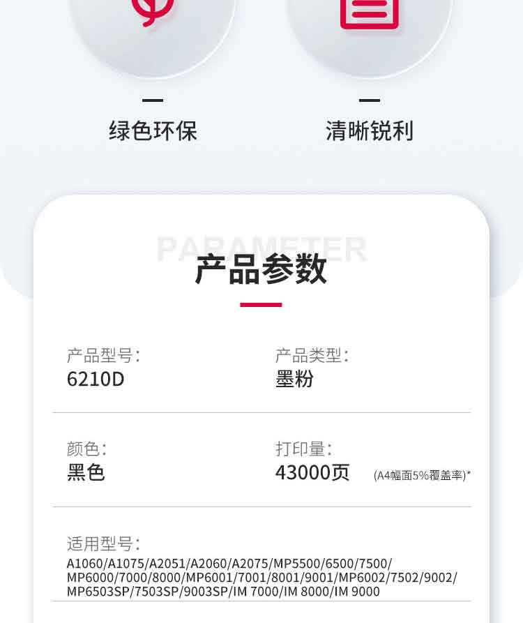 • 商品名稱:理光 6210D 碳粉1支裝 適用A1060/A1075/A2051/A2060/A2075 /MP5500/6500/7500/MP6000/7000/8000/ MP6001/7001/8001/9001/MP6002/7502/9002/MP6503SP/7503SP/9003SP IM 7000/IM 8000/IM 9000