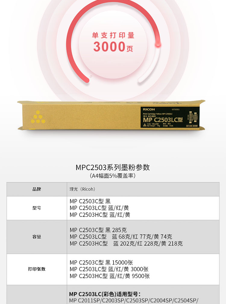 理光 MPC2503LC 黃色碳粉盒1支裝 適用MP C2003SP/C2503SP/C2011SP/C2004SP/C2504SP/IM C2000/C2500