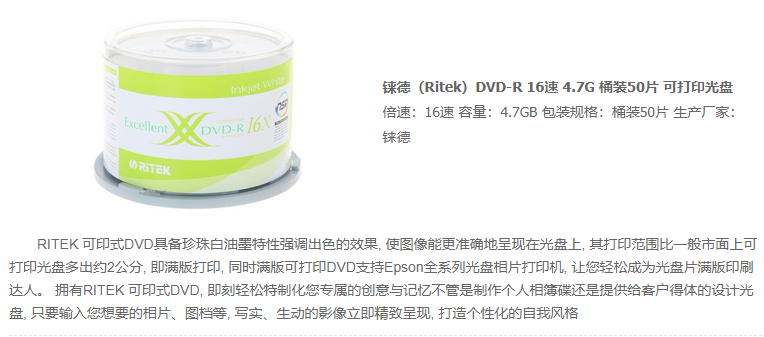 • 商品名稱:錸德(RITEK) 臺(tái)產(chǎn)可打印 DVD-R 16速4.7G 空白光盤/光碟/刻錄盤 桶裝50片