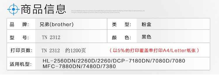 • 商品名稱:兄弟(brother)TN-2325粉盒 適用于兄弟2560/2260/7180/ 7080/7080D/7380/7480D/ 7880DN
