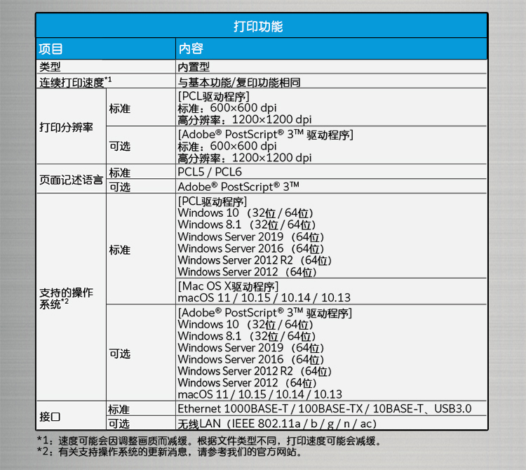 • 連續(xù)打印頁數(shù):A4橫向/JIS B5橫向:25張/分鐘 A4:19張/分鐘 JIS B5:11張/分鐘 JIS B4:16張/分鐘 A3:14張/分鐘