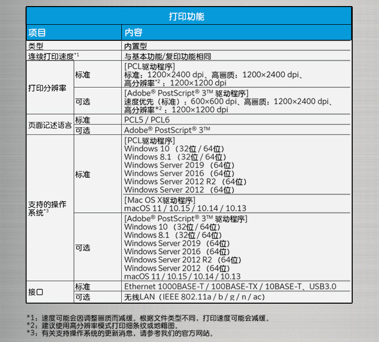 • 連續(xù)打印頁數(shù):A4橫向 / JIS B5橫向 黑白:30頁/分鐘 彩色:30頁/分鐘;A4 黑白:23頁/分鐘 彩色:23頁/分鐘;JIS B5 黑白:17頁/分鐘 彩色:17頁/分鐘;B4 黑白:20頁/分鐘 彩色:20頁/分鐘;A3 黑白:17頁/分鐘 彩色:17頁/分鐘