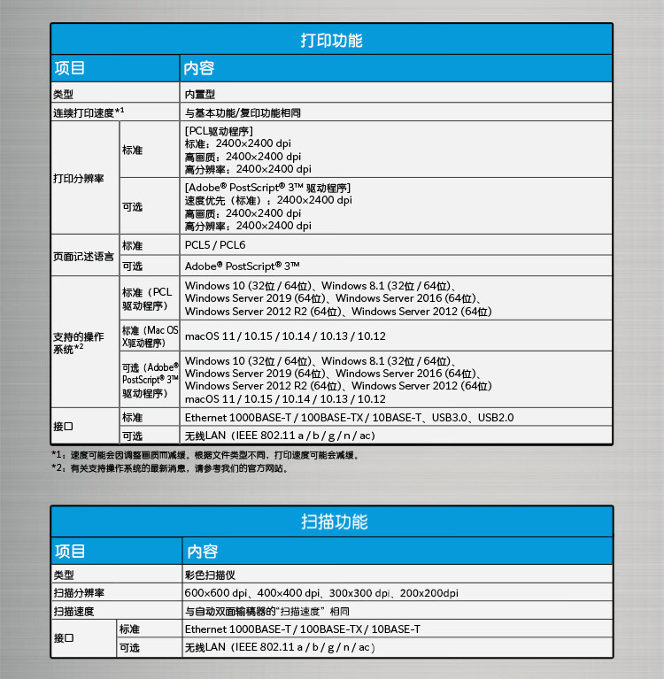 • 連續(xù)打印頁數(shù):A4橫向/ JIS B5橫向:黑白:65頁/分鐘 彩色:65頁/分鐘;A4 / JIS B5:黑白:47頁/分鐘 彩色:47頁/分鐘;JIS B4:黑白:39頁/分鐘 彩色:39頁/分鐘;A3:黑白:34頁/分鐘 彩色:34頁/分鐘