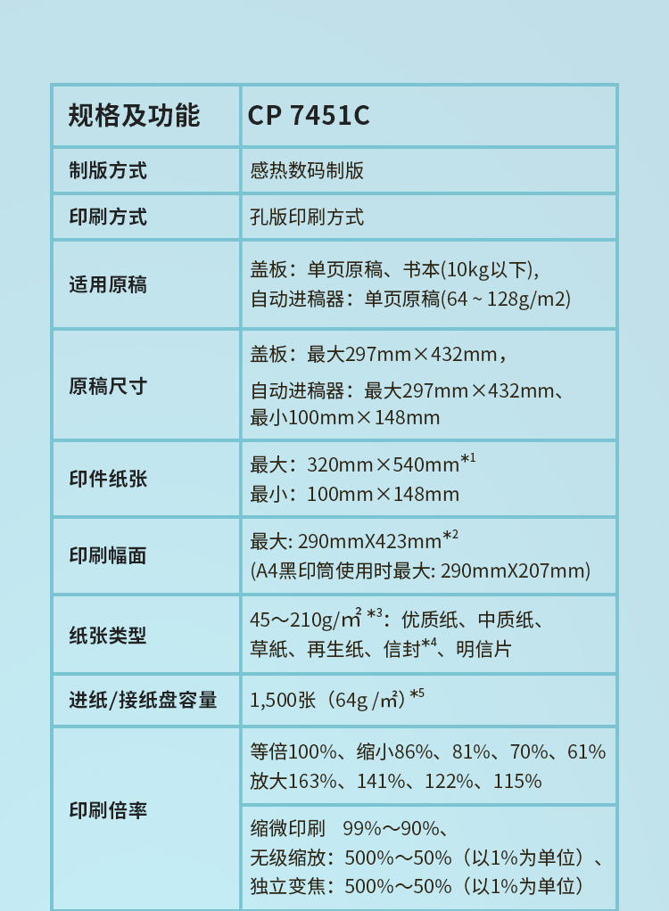 • 商品名稱:基士得耶CP7451C 速印機(主機+自動送稿器+網(wǎng)絡(luò)打印卡+紙條分頁器+6袋油墨+4卷版紙+工作臺)
