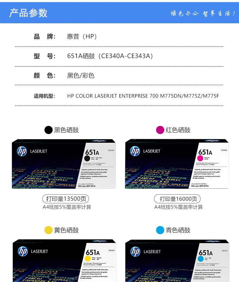 • 商品名稱:惠普(HP) CE340A 651A 13500頁 硒鼓 一支 適用于/M775dn/M775z/M775F 黑色