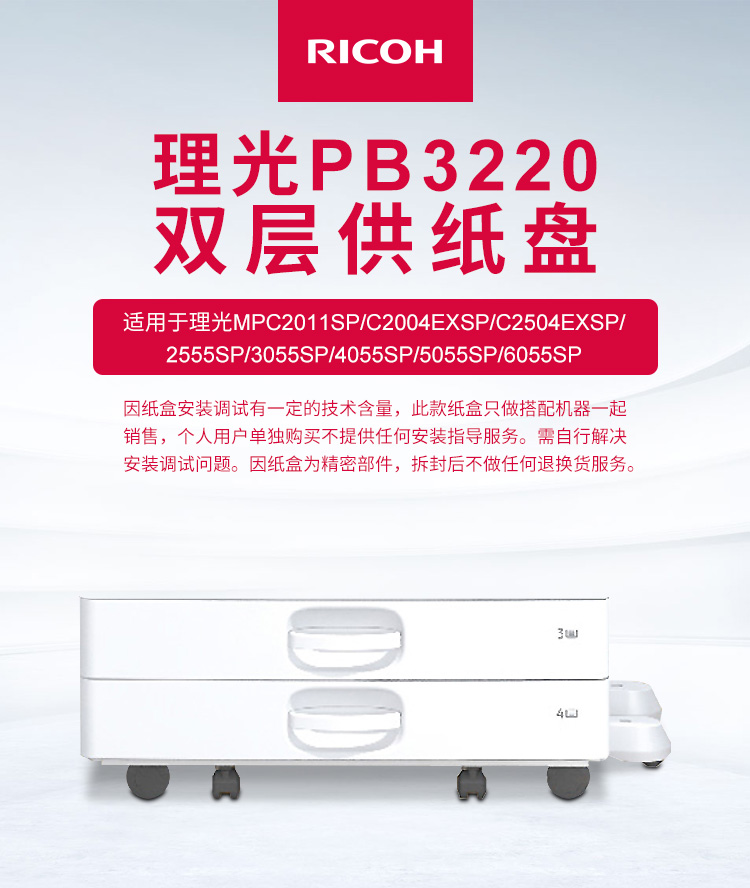 - 商品名稱:理光(Ricoh)雙層供紙盤PB3220(550張*2)適用于MPC2011/C2004/C2504/2555/3055/3555/4055/5055/6055SP