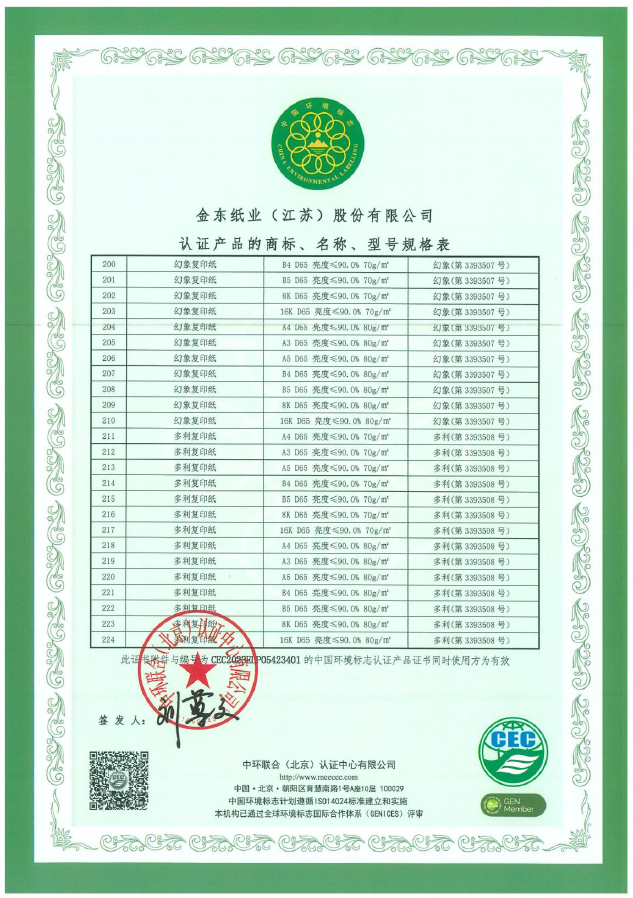 • 環(huán)境標(biāo)志產(chǎn)品認(rèn)證證書(shū)編號(hào):CEC2023ELP05423401