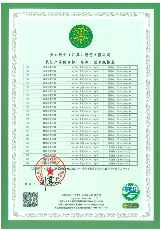 • 環(huán)境標(biāo)志產(chǎn)品認證證書編號:CEC2023ELP05423401