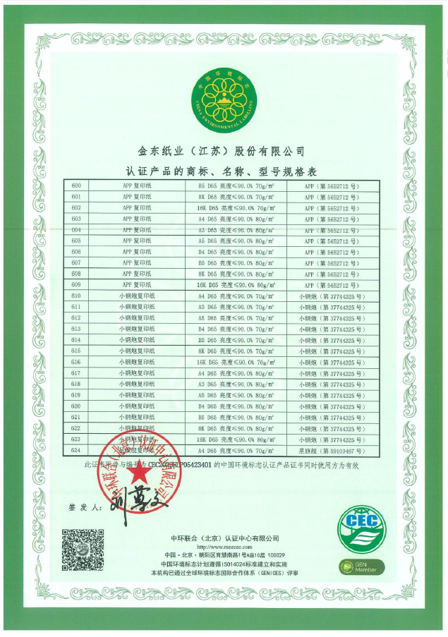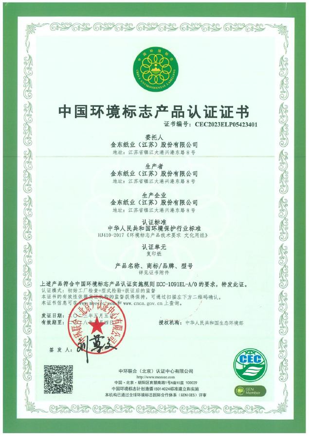 • 環(huán)境標(biāo)志產(chǎn)品認(rèn)證證書編號(hào):CEC2023ELP05423401