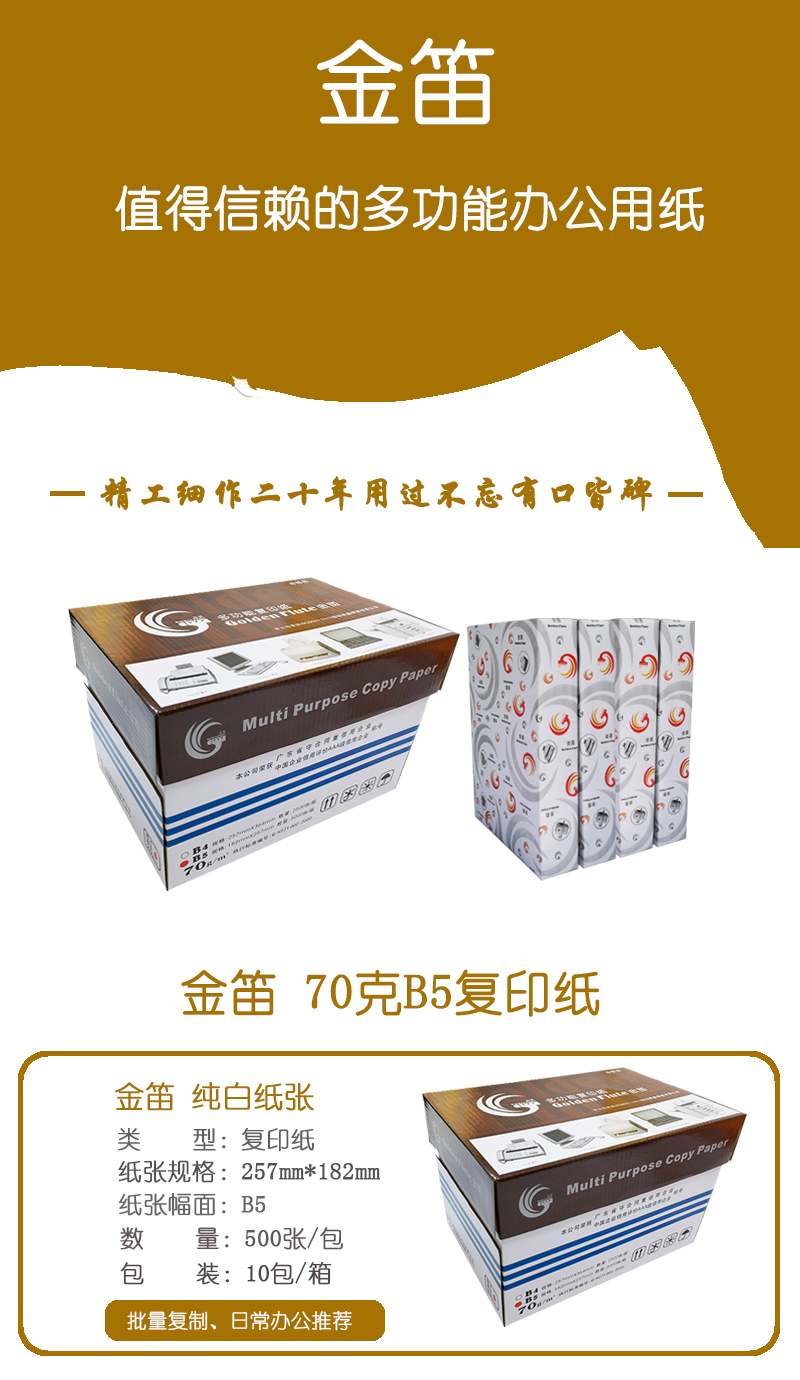 • 商品名稱:金笛 70克B5 復(fù)印紙 10包/箱 500張/包(單價 元/箱) 廠家直銷