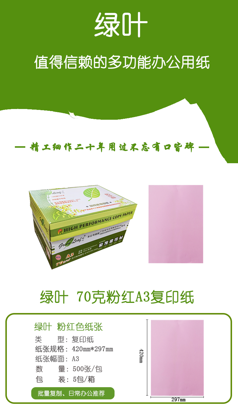 綠葉 70克粉紅A3 優(yōu)等品彩色復(fù)印紙 5包/箱 500張/包(單價(jià) 元/箱)廠家直銷