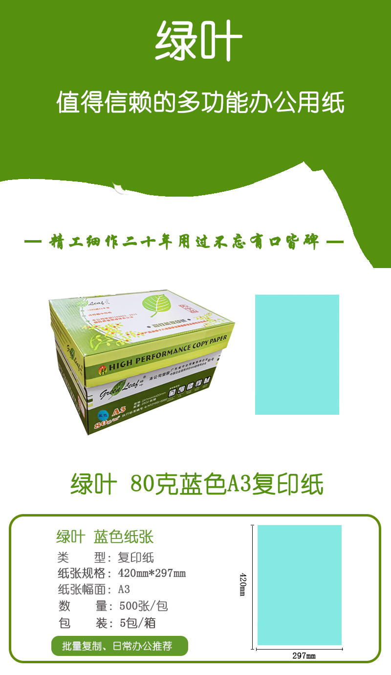 綠葉 80克藍色A3 優(yōu)等品彩色復印紙 500張/包 5包/箱(單價 元/箱)廠家直銷