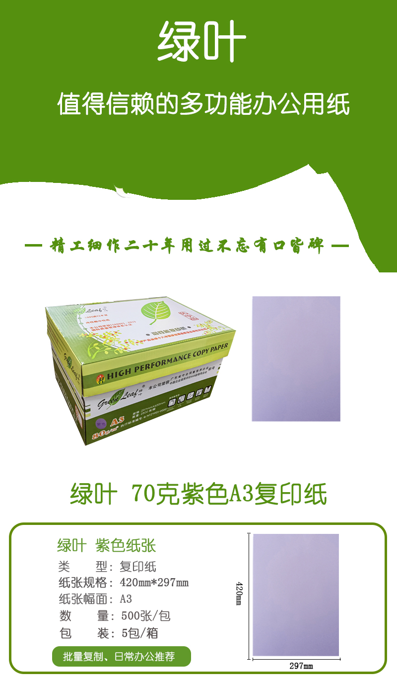 綠葉 80克紫色A3 優(yōu)等品彩色復(fù)印紙 500張/包 5包/箱(單價(jià) 元/箱)廠家直銷(xiāo)