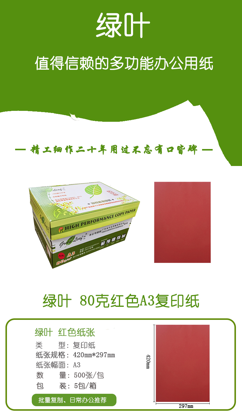 • 商品名稱:綠葉 80克大紅色A3 優(yōu)等品彩色復印紙 500張/包 5包/箱(單價 元/箱)廠家直銷