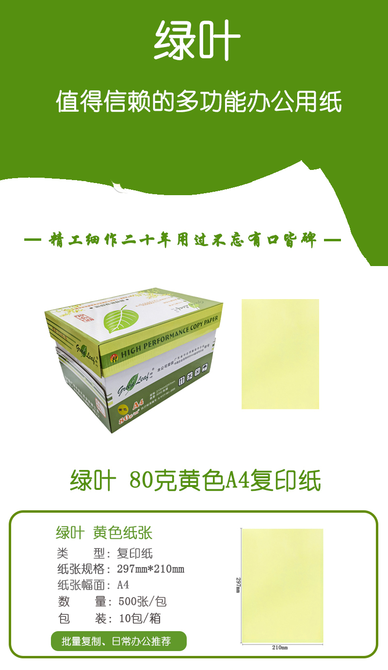 • 商品名稱:綠葉 80克黃色A4 優(yōu)等品彩色復(fù)印紙 500張/包 10包/箱(單價(jià) 元/箱)廠家直銷