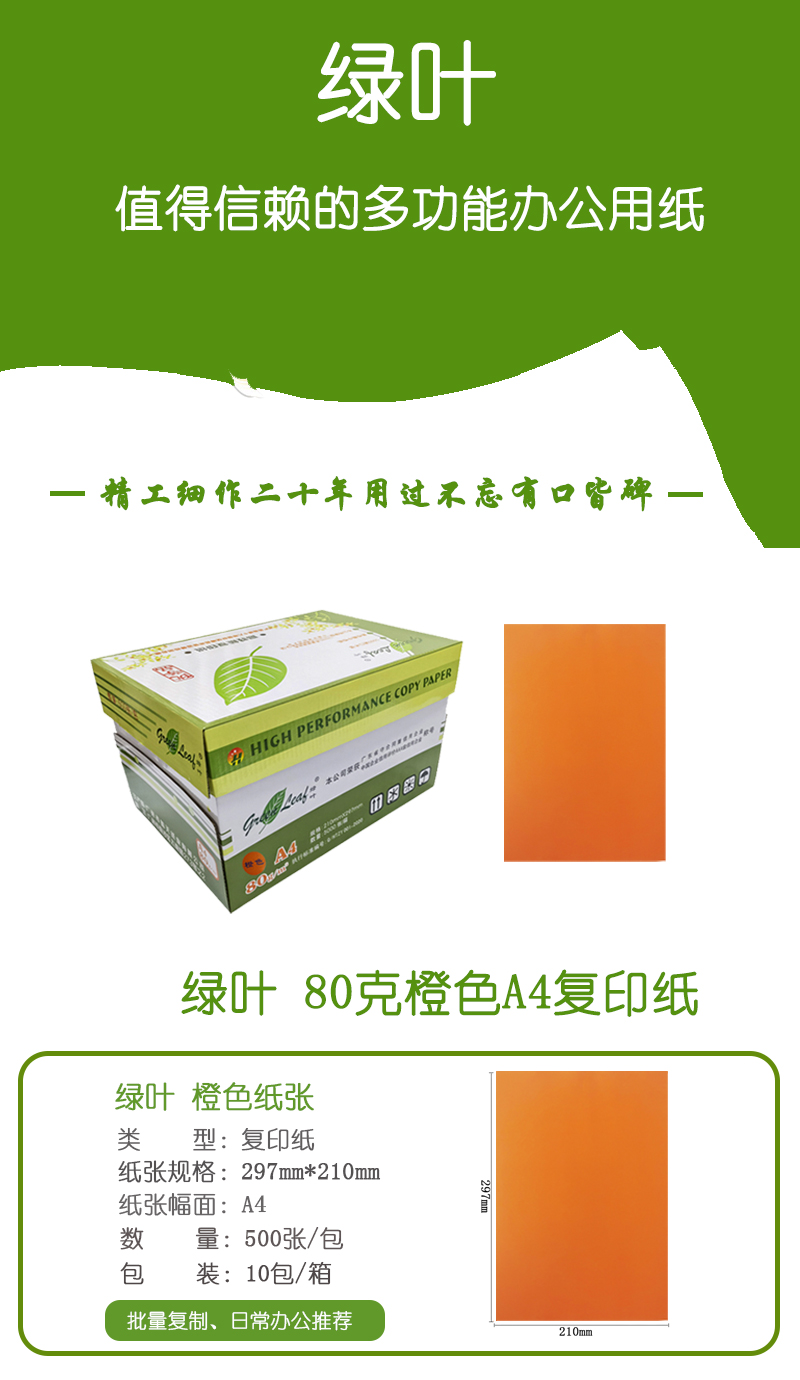 綠葉 80克橙色A4 優(yōu)等品彩色復(fù)印紙 500張/包 10包/箱(單價(jià) 元/箱)廠家直銷