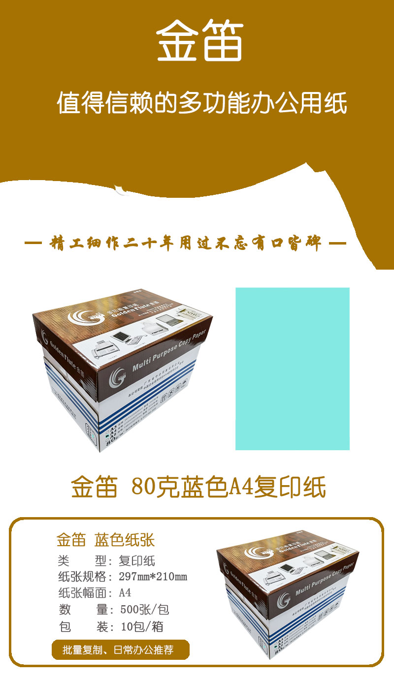 • 商品名稱:金笛 80克藍色A4 優(yōu)等品彩色復(fù)印紙 500張/包 10包/箱(單價 元/箱)廠家直銷