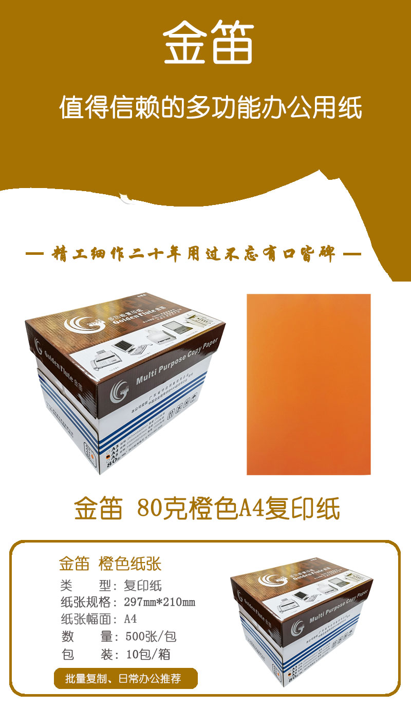 • 商品名稱:金笛 80克橙色A4 優(yōu)等品彩色復(fù)印紙 500張/包 10包/箱(單價(jià) 元/箱)廠家直銷