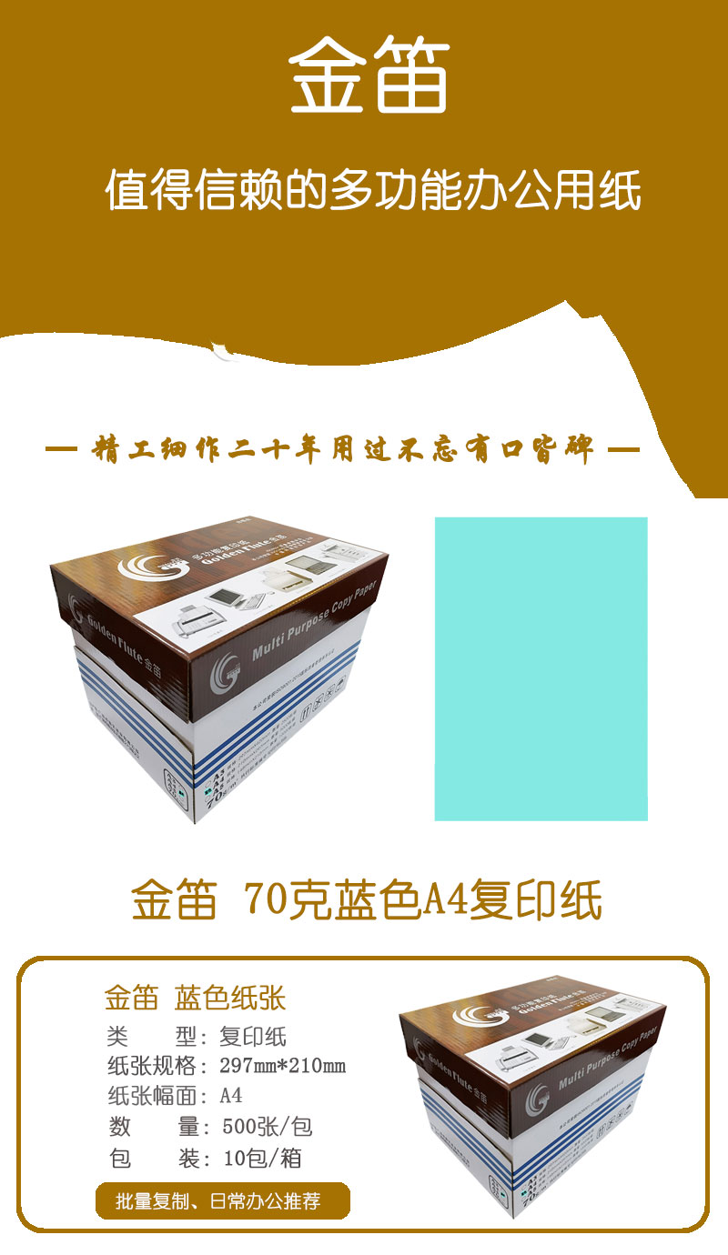 • 商品名稱:金笛 70克藍(lán)色A4 優(yōu)等品彩色復(fù)印紙 10包/箱 500張/包(單價(jià) 元/箱)廠家直銷