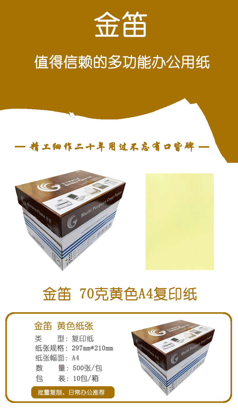 • 商品名稱:金笛 70克黃色A4 優(yōu)等品彩色復(fù)印紙 10包/箱 500張/包(單價(jià) 元/箱)廠家直銷