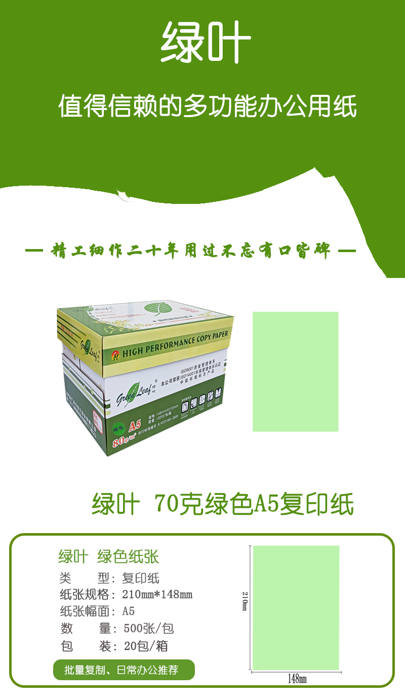 綠葉 70克綠色A5 優(yōu)等品彩色復(fù)印紙 20包/箱 500張/包(單價 元/箱)廠家直銷