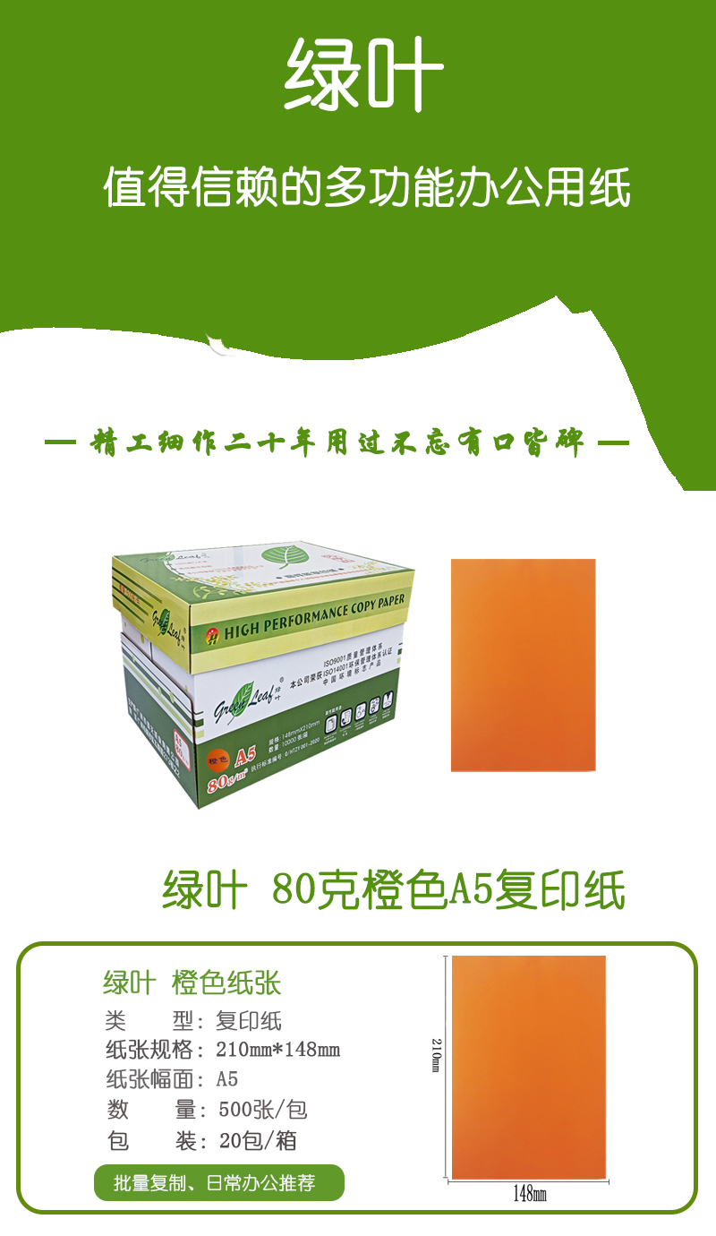 綠葉 80克橙色A5 優(yōu)等品彩色復(fù)印紙 500張/包 20包/箱(單價(jià) 元/箱)廠家直銷