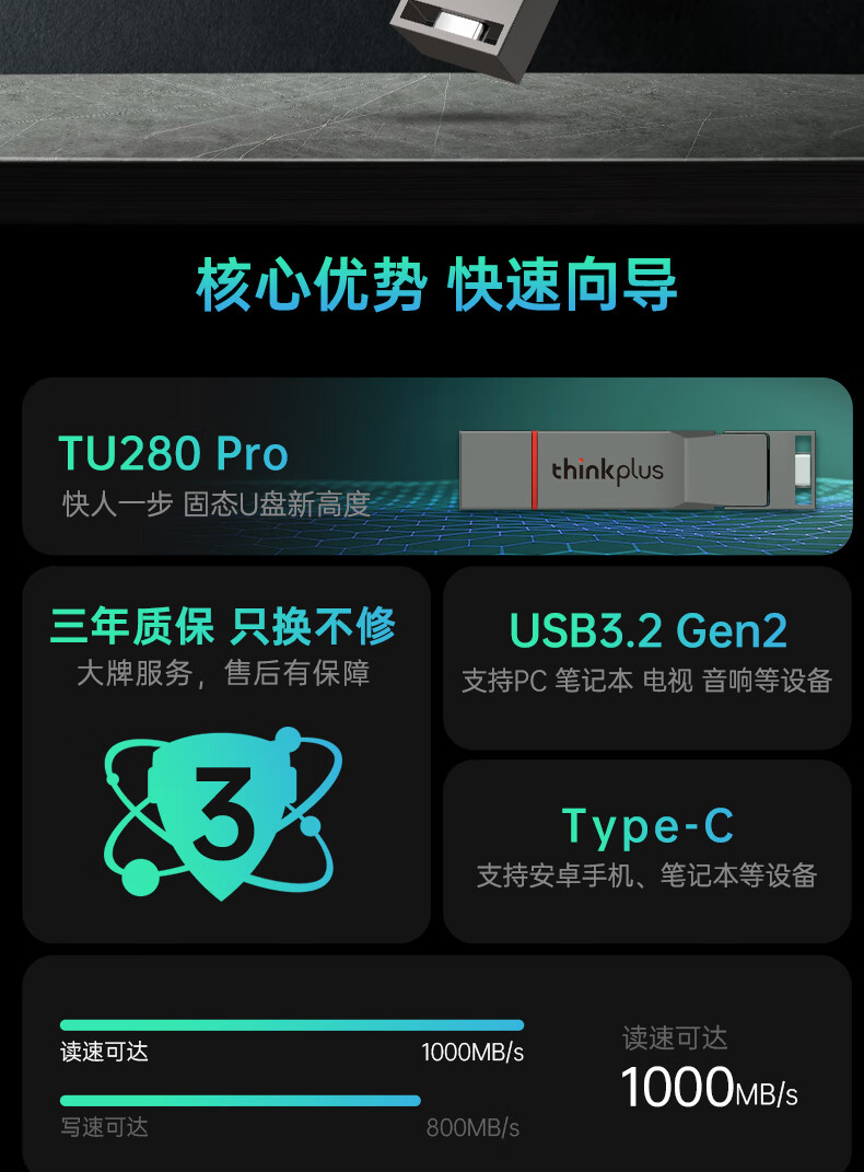 聯(lián)想thinkplus TU280 Pro 512G固態(tài)u盤 usb/type-c雙接口
