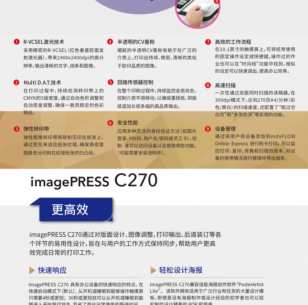 • 速度說明:A4(80gsm):80PPM (黑白),70PPM (彩色)