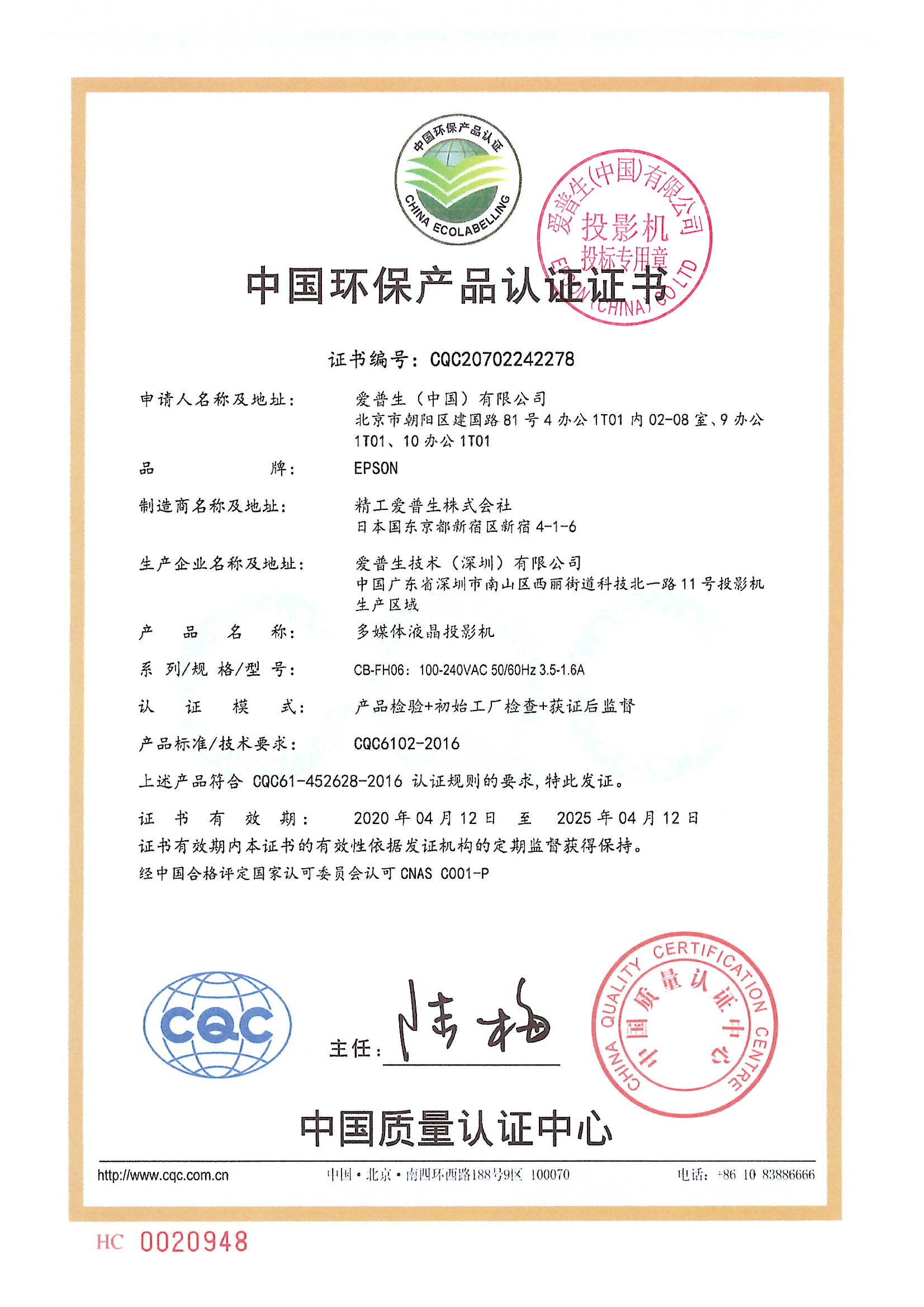 • 環(huán)境標(biāo)志證書編號:CQC20702242278