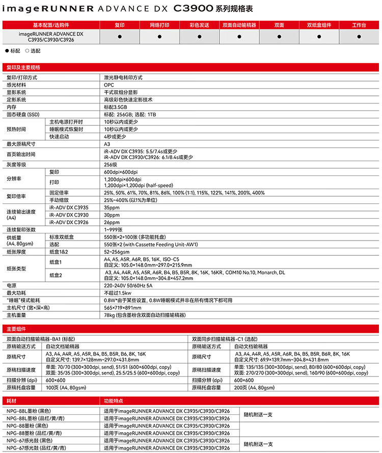 • 商品名稱:佳能(Canon)iRAC3930(3830升級版) 商用辦公a3a4彩色復(fù)合機 雙面復(fù)印/掃描/自動輸稿器/四紙盒