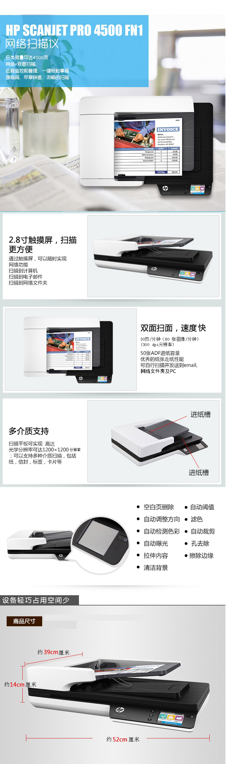 • 商品名稱:惠普(HP) SCANJET PRO 4500 FN1專業(yè)辦公 A4掃描儀