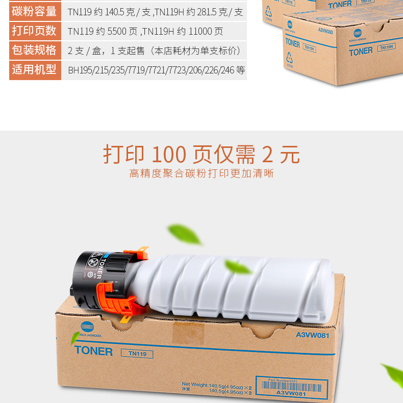 • 商品名稱:柯尼卡美能達(dá)(KONICA MINOLTA)TN-119H高容量碳粉適用于195/206/235/7719