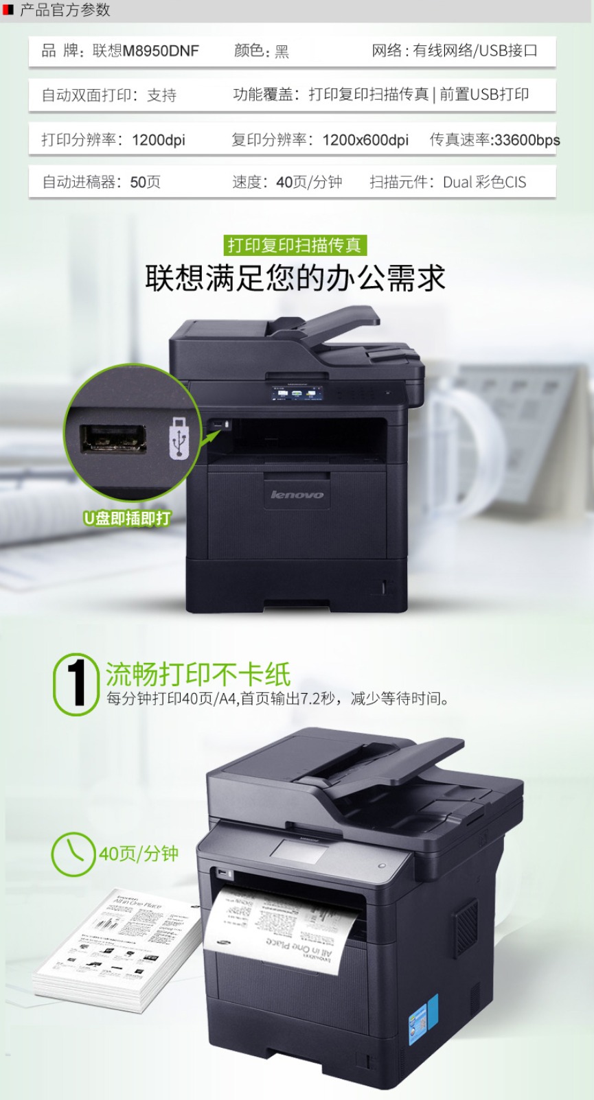聯(lián)想(Lenovo)A4黑白多功能一體機(jī)M8950DNF 打印 復(fù)印 掃描 傳真/支持有線網(wǎng)絡(luò)打印/自動(dòng)雙面打印/40ppm/自動(dòng)進(jìn)稿器/內(nèi)存512M