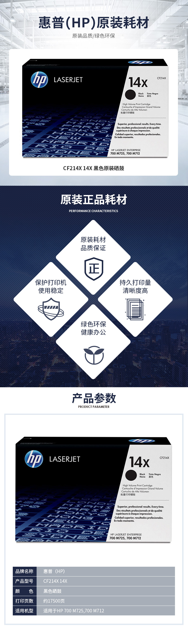 - 商品名稱:惠普(HP)14X 黑色大容量硒鼓 CF214X 打印量17,500頁 適用于HP LaserJet Enterprise 700 M712 系列 HP LaserJet Enterprise 700 M725 系列