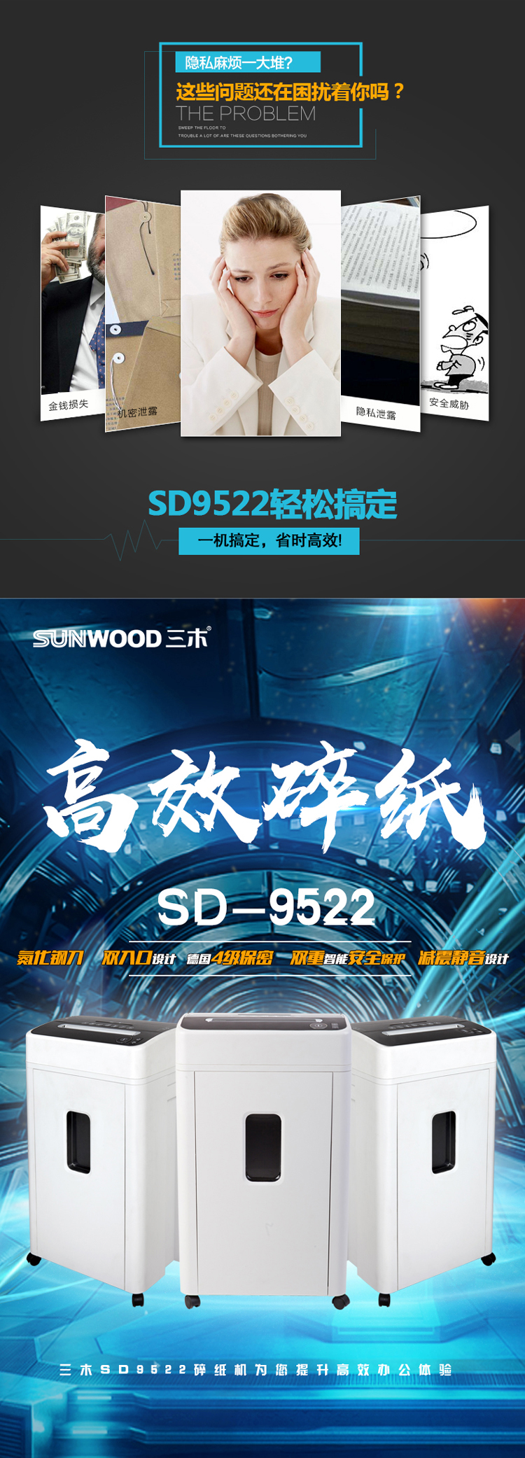 三木(SUNWOOD) MSD9522碎紙機(jī) 4級保密 觸停保護(hù) 高效靜音 雙入口 可碎釘/卡/光盤