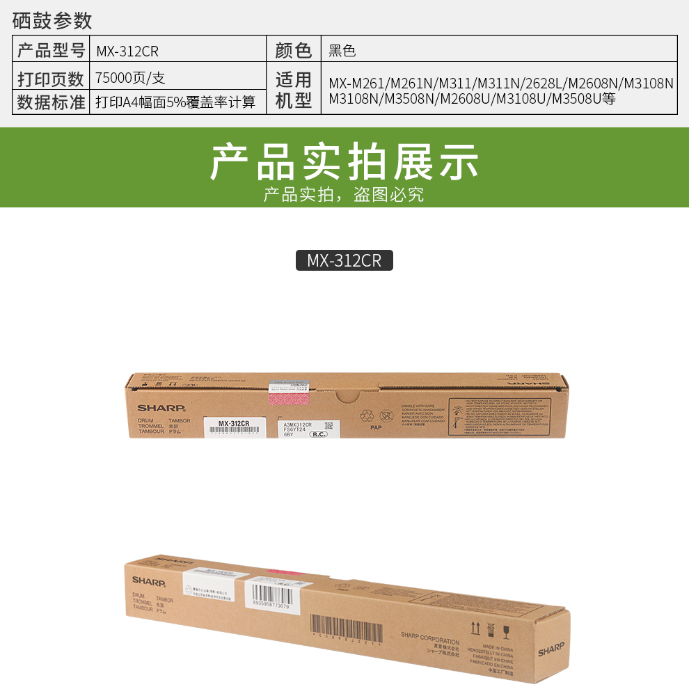 夏普(SHARP)MX-312CR鼓芯 適用于MX-M261/M261N/M311/M311N/2628L/M2608N/M3108N/M3508N/M2608U/M3108U/M3508U