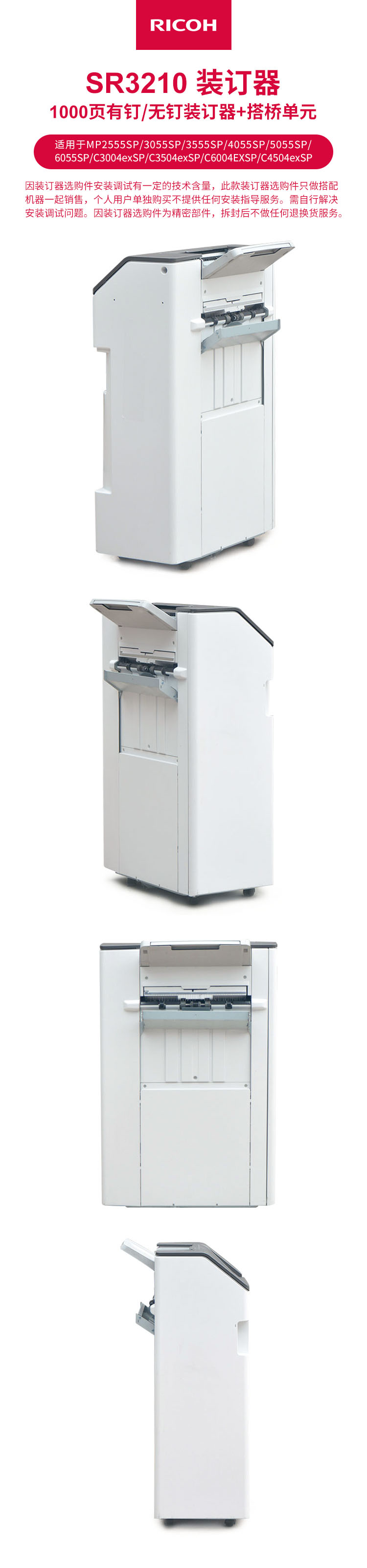 • 商品名稱:理光(Ricoh)SR3210 裝訂器 1000頁(yè)有釘/無(wú)釘裝訂器+搭橋單元 適用于MP2555SP/3055SP/C3004exSP/C3504exSP
