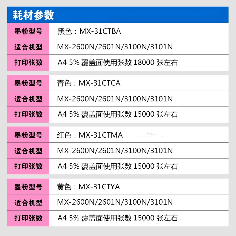 • 商品名稱:夏普(SHARP)MX-31CTMA紅色粉 適用于MX-2600N/2601N/3100N/3101N