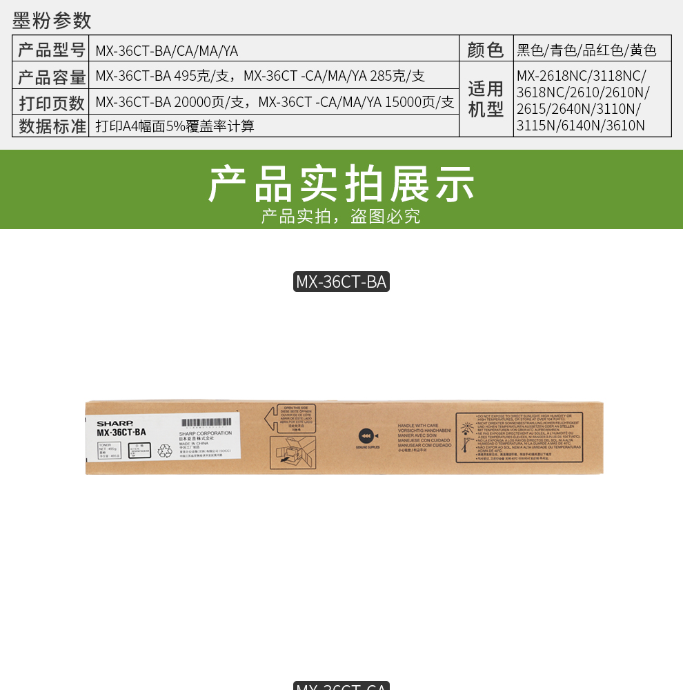 • 商品名稱:夏普(SHARP)MX-36CT-BA黑色粉 適用于MX-2618NC/3118NC/3618NC/2610/2610N/2615/2640N/3110N/3115N/6140N/3610N