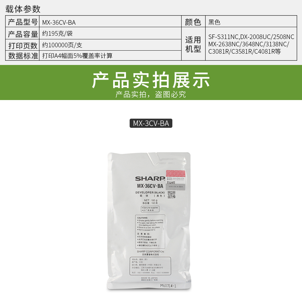 夏普(SHARP)MX-36CV-BA黑色載體 適用于SF-S311NC,DX-2008UC/2508NC/MX-2638NC/3648NC/3138NC/C3081R/C3581R/C4081R