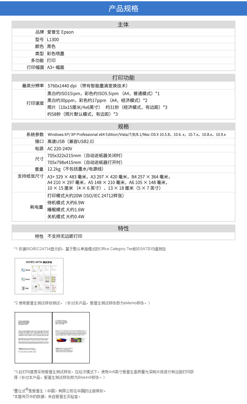 • 商品名稱:愛普生(EPSON)L1300 墨倉式 A3+高速圖形設(shè)計專用 照片打印 噴墨打印機(jī)