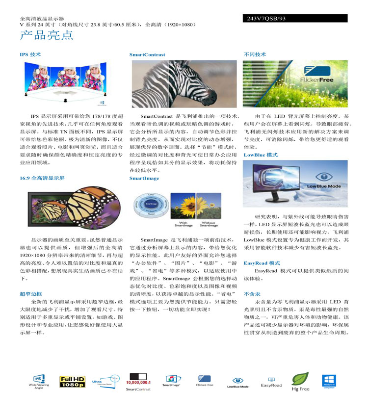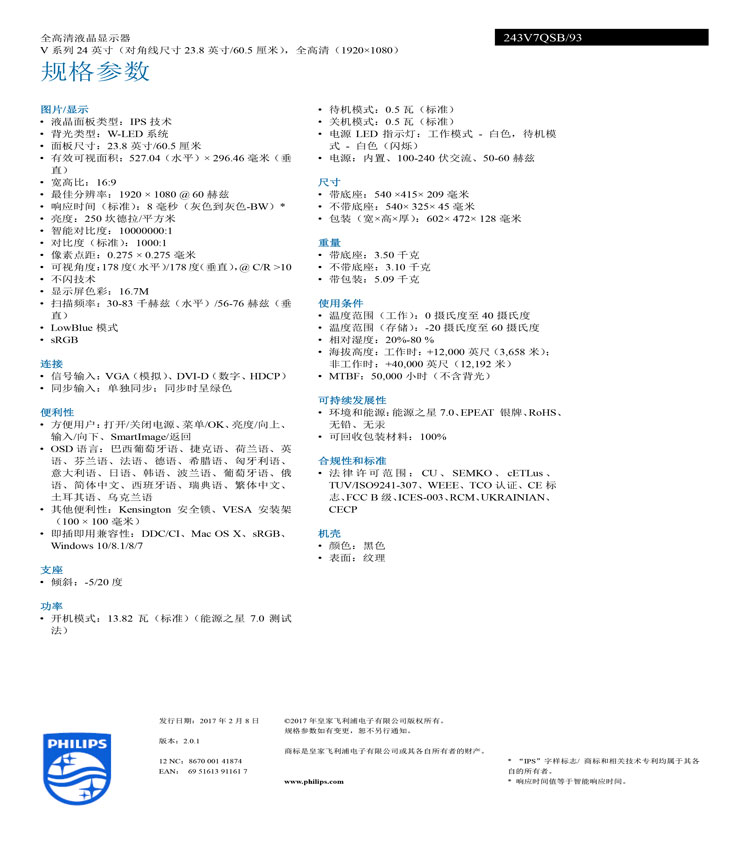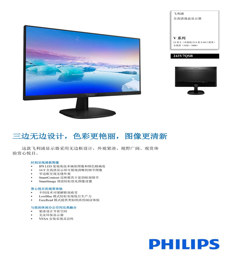 • 商品名稱:飛利浦(Philips)243V7QSBF液晶顯示器23.8寸VGA/DVI接口分辨率1920×1080