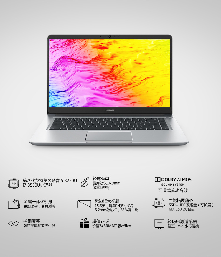 華為(HUAWEI)MateBook D MRC-W50 輕薄商務(wù)筆記本電腦 15.6英寸 皓月銀(I5-8250U/8G內(nèi)存/128G固態(tài) 1T機(jī)械/2G獨(dú)顯/無光驅(qū)/Windows 10 正版Office/二年保修)